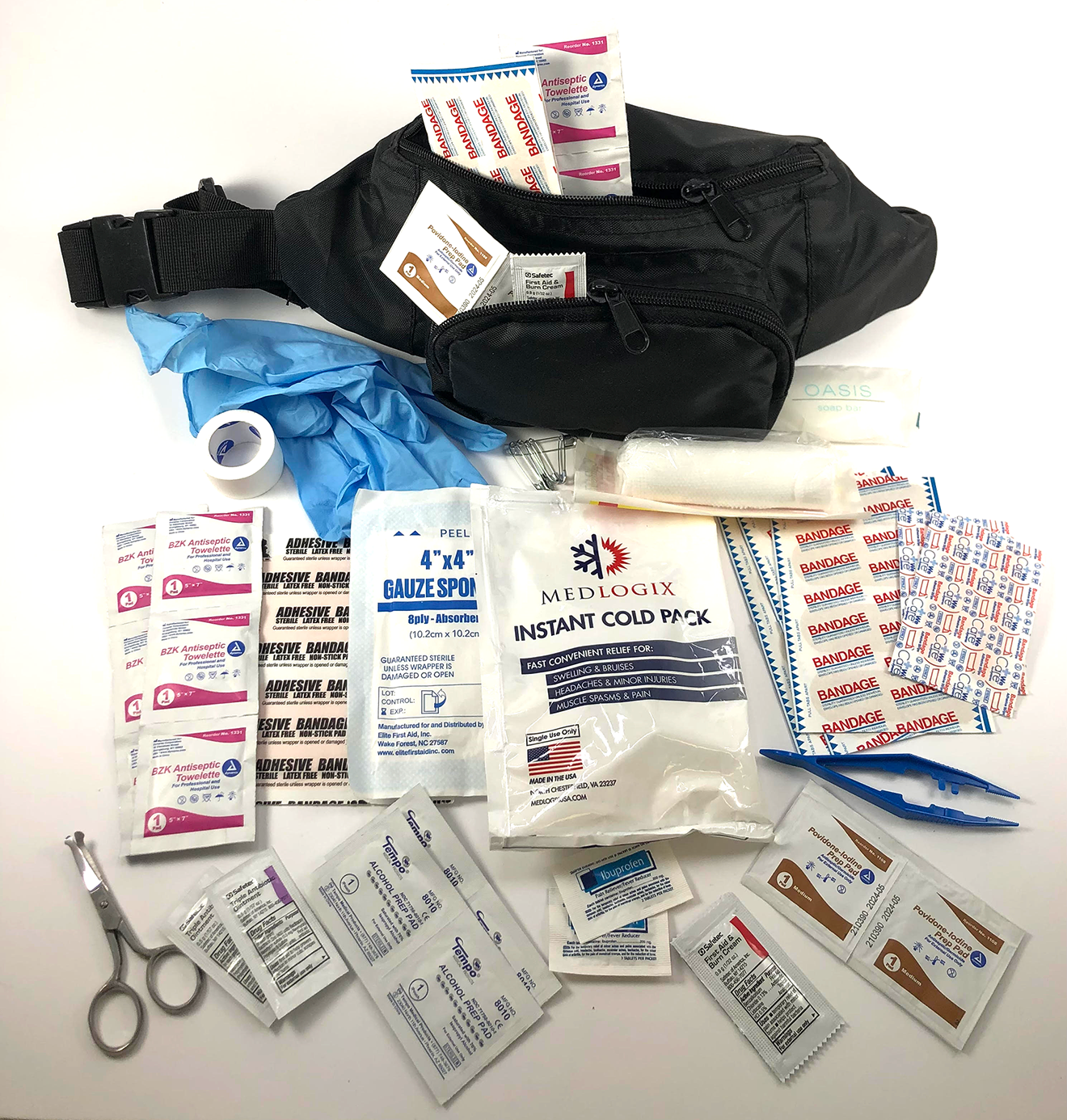 This crossbody/ waist bag is a must have EDC item wherever you go. This 365CARRY has IFAK go bag essentials: 2) 4"x4" Sterile Gauze, 5) 1"x3" Bandage Strips, 2) Knuckle Bandages, 2) 2"x4" Bandage Strips, 1) 4"x4.1 yds Conforming Gauze, Nitrile Gloves, 1) 1"Tape Roll, Scissors, Tweezers, 2) Triple Antibiotics, 2) First Aid/Burn Creams, 4) Alcohol Wipes, 8) BZK Antiseptic Wipes, 3) Iodine Wipes, 1) Instant Ice Pack, 4) Pain Relievers, 6) Safety Pins, Hand Soap, and First Aid Instructions in a resealable bag.