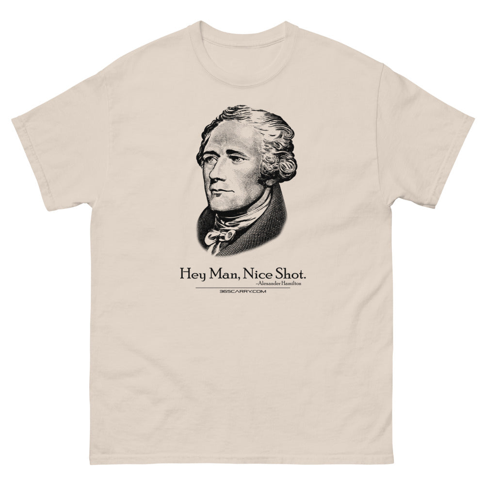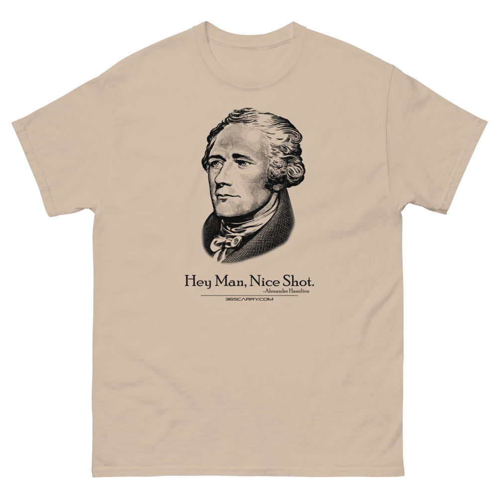 Alexander Hamilton: Soldier and Statesman. Before the weird woke musical, most people only knew him as the guy on the sawbuck ! He wrote in the Federalist Papers: "The best we can hope for concerning the people at large is that they be properly armed". And being a gentleman, we'd like to think that he gave props to Aaron Burr's center mass shot. A cool t-shirt for every occasion... Plus, it's extra trendy now!